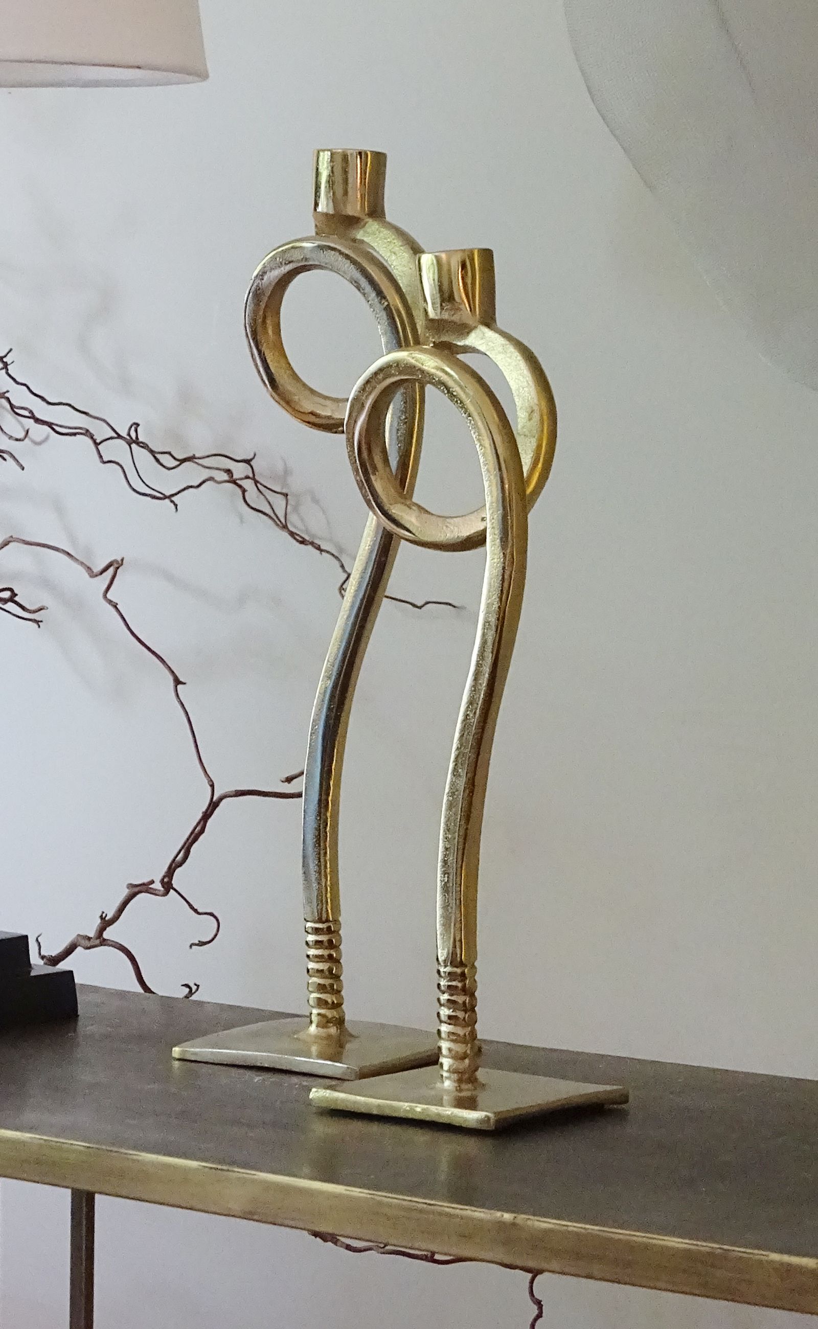 Każdy element został ręcznie wykończony, dzięki czemu świeczniki mają niepowtarzalny charakter i delikatne różnice w odcieniach metalu.