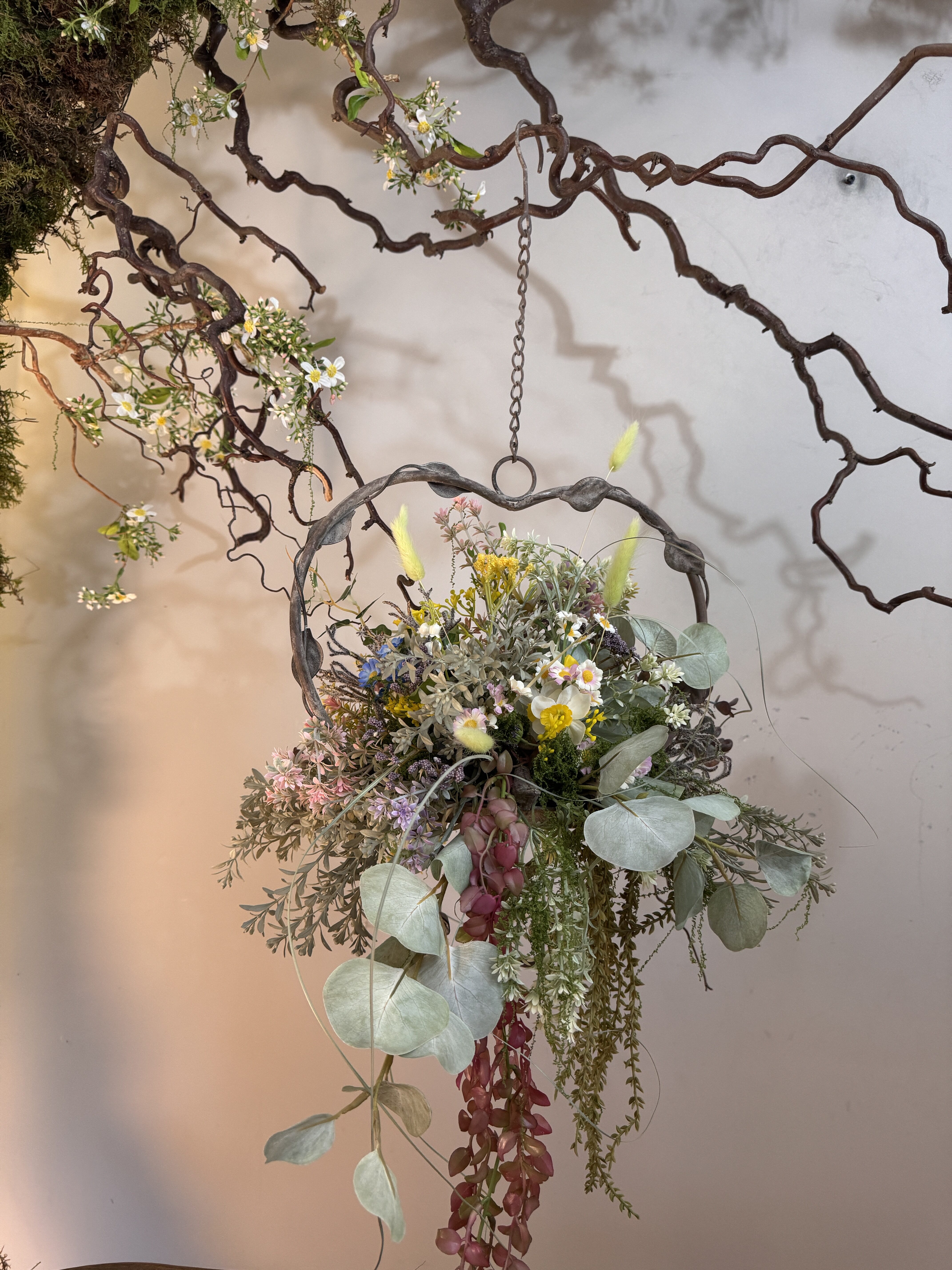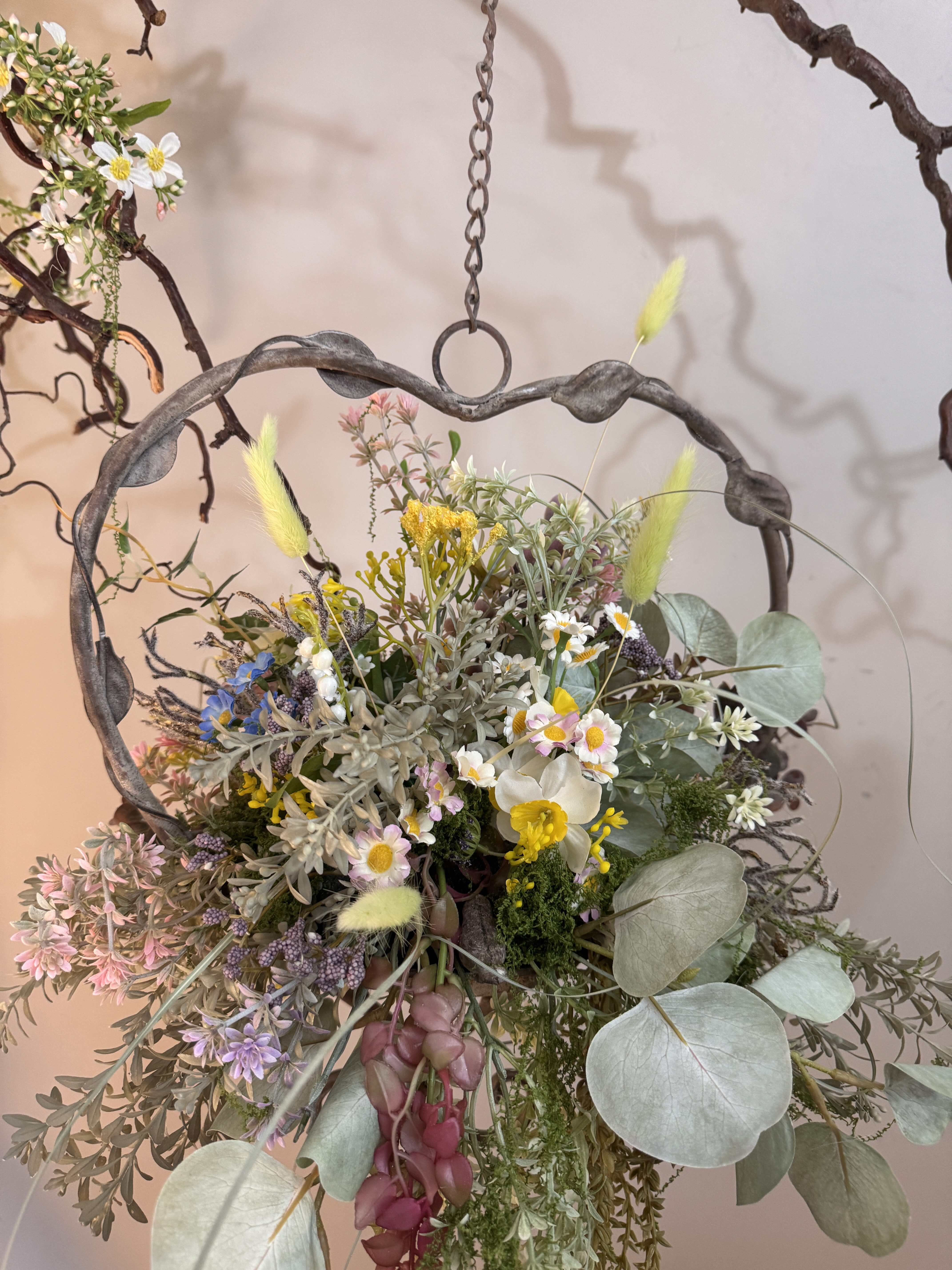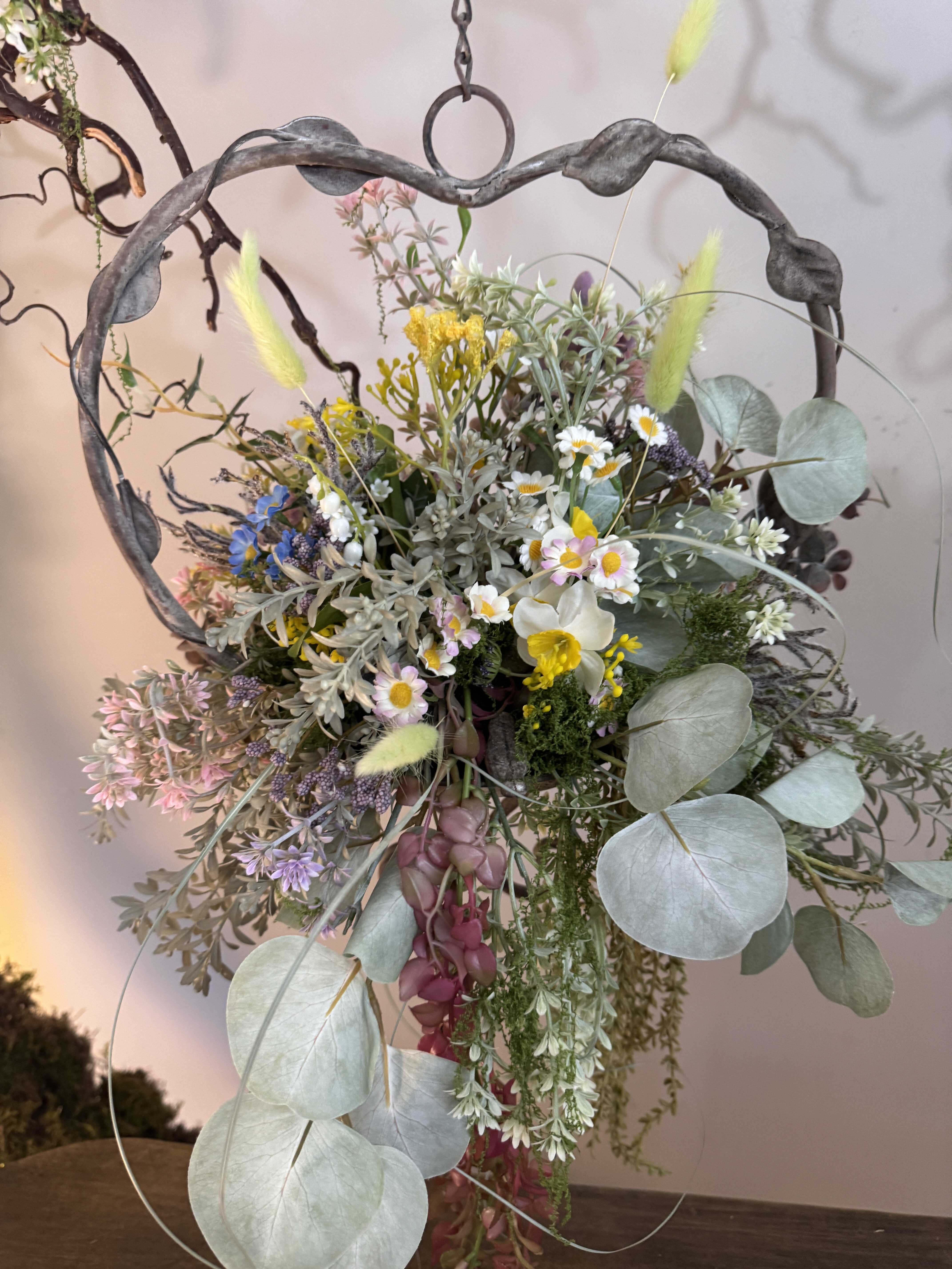 Starannie dobrane elementy roślinne – delikatne stokrotki, pastelowe kwiaty, ozdobne trawy oraz srebrzyste liście eukaliptusa – tworzą harmonijną kompozycję inspirowaną naturą. Zwisające gałązki dodają dekoracji dynamiki i sprawiają, że prezentuje się efektownie z każdej strony.