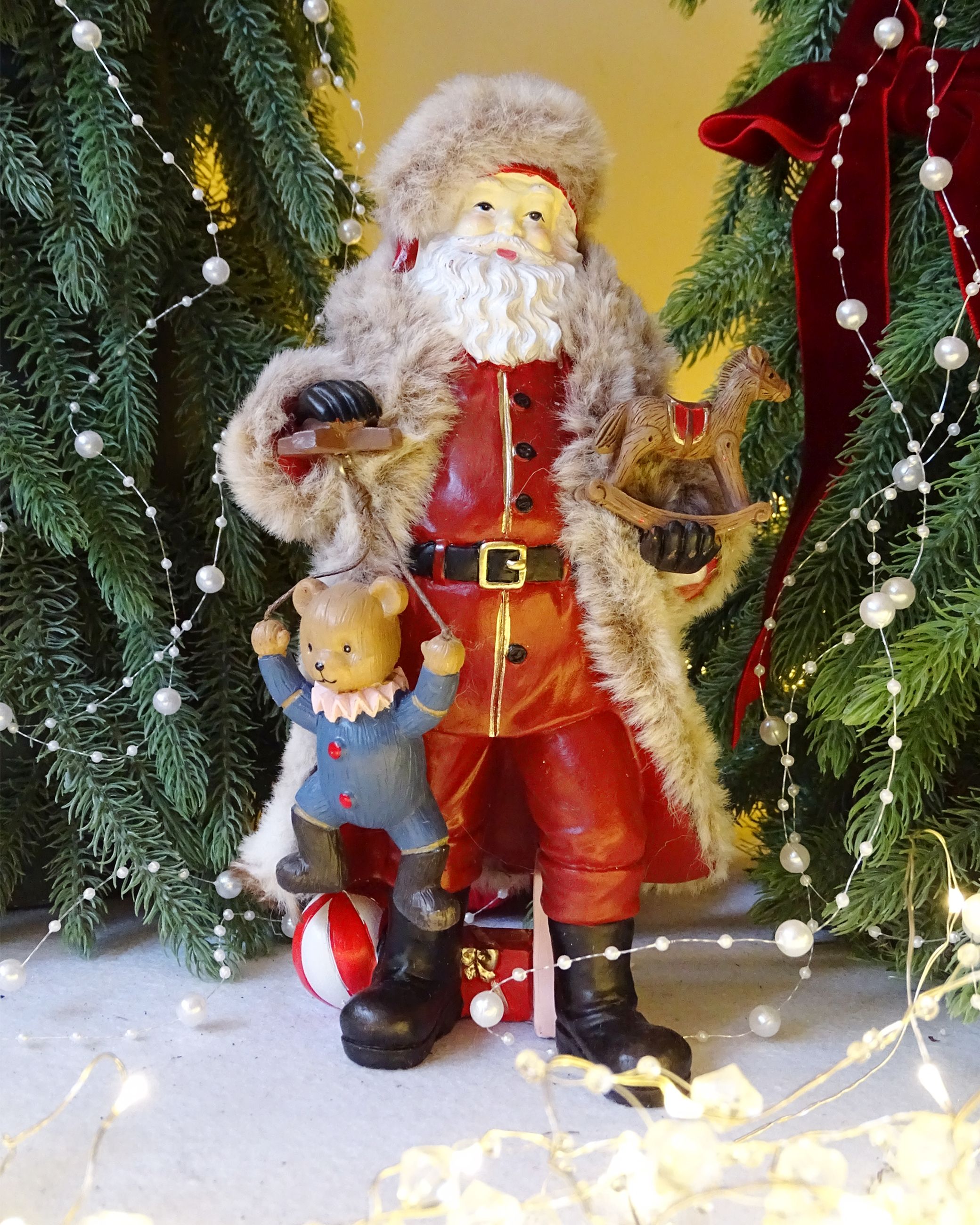 Wprowadź do swojego domu ciepło i radość Świąt Bożego Narodzenia dzięki tej wyjątkowej figurce świątecznej przedstawiającej Świętego Mikołaja w futrzanym płaszczu, z uroczym misiem i konikiem na biegunach. To dekoracja, która zachwyca elegancją i dbałością o detale – od realistycznej brody i uśmiechu Mikołaja po misternie odwzorowane zabawki i futrzane wykończenia.