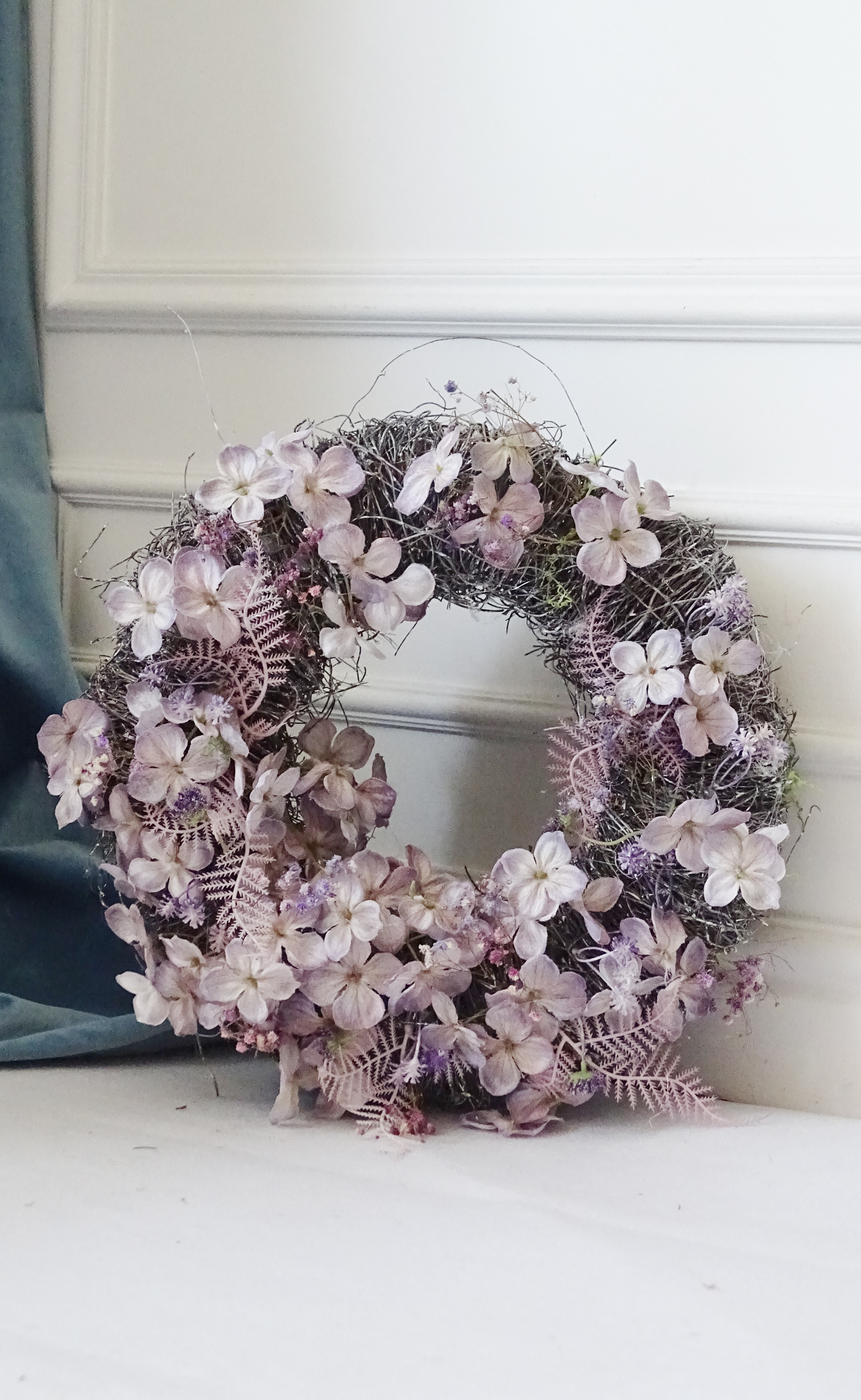 Jesienny wianek na drzwi z hortensjami w odcieniach lawendy