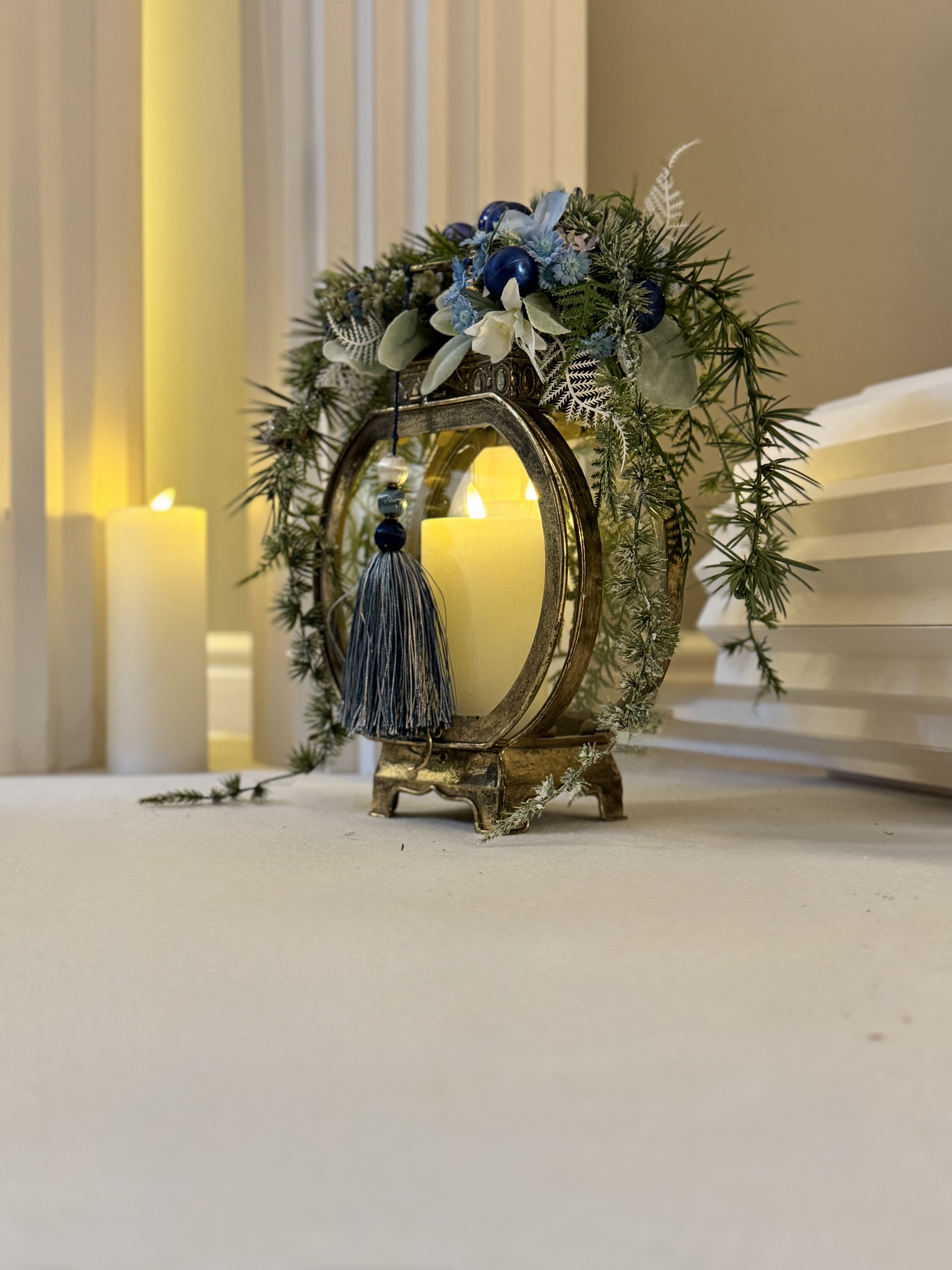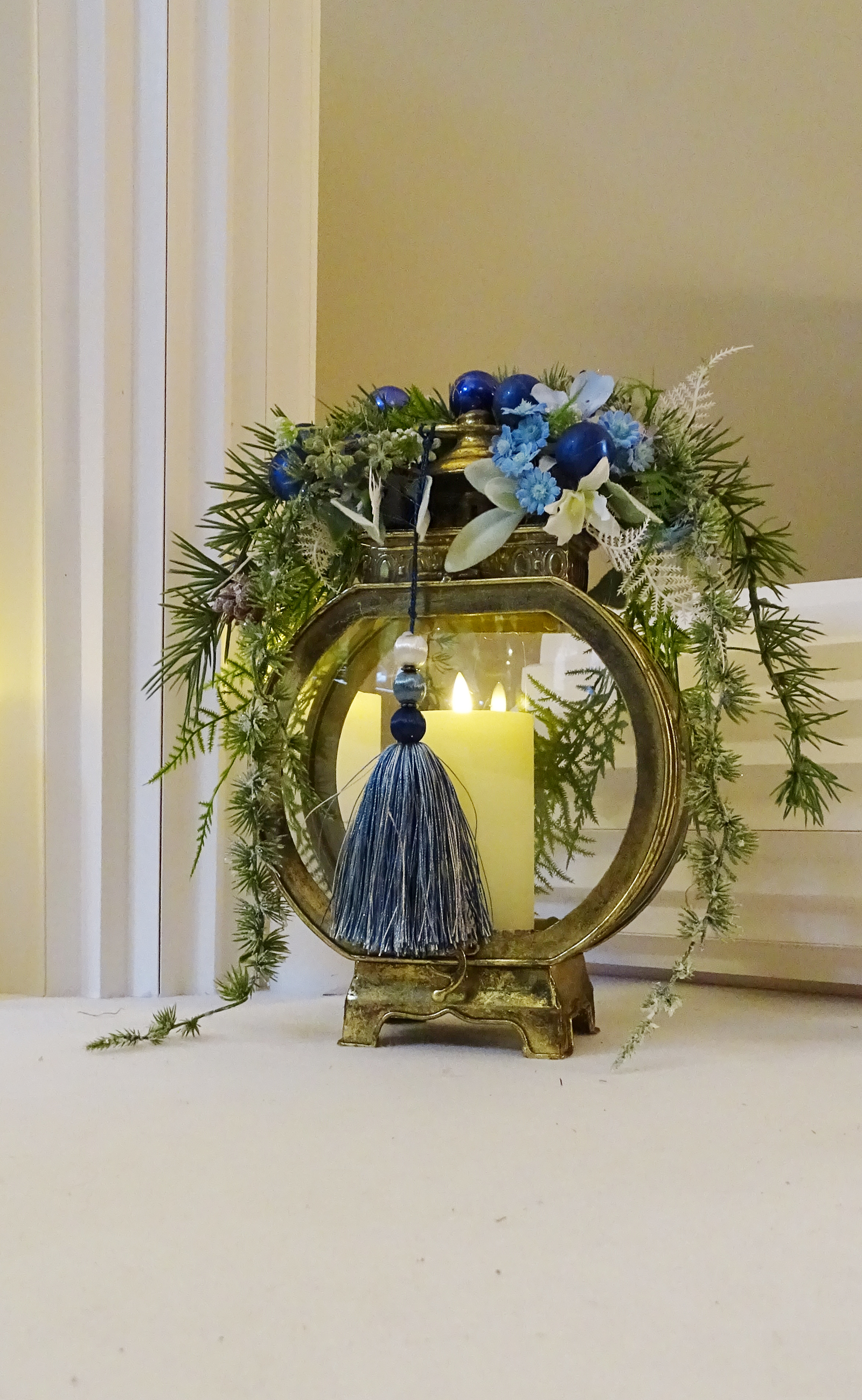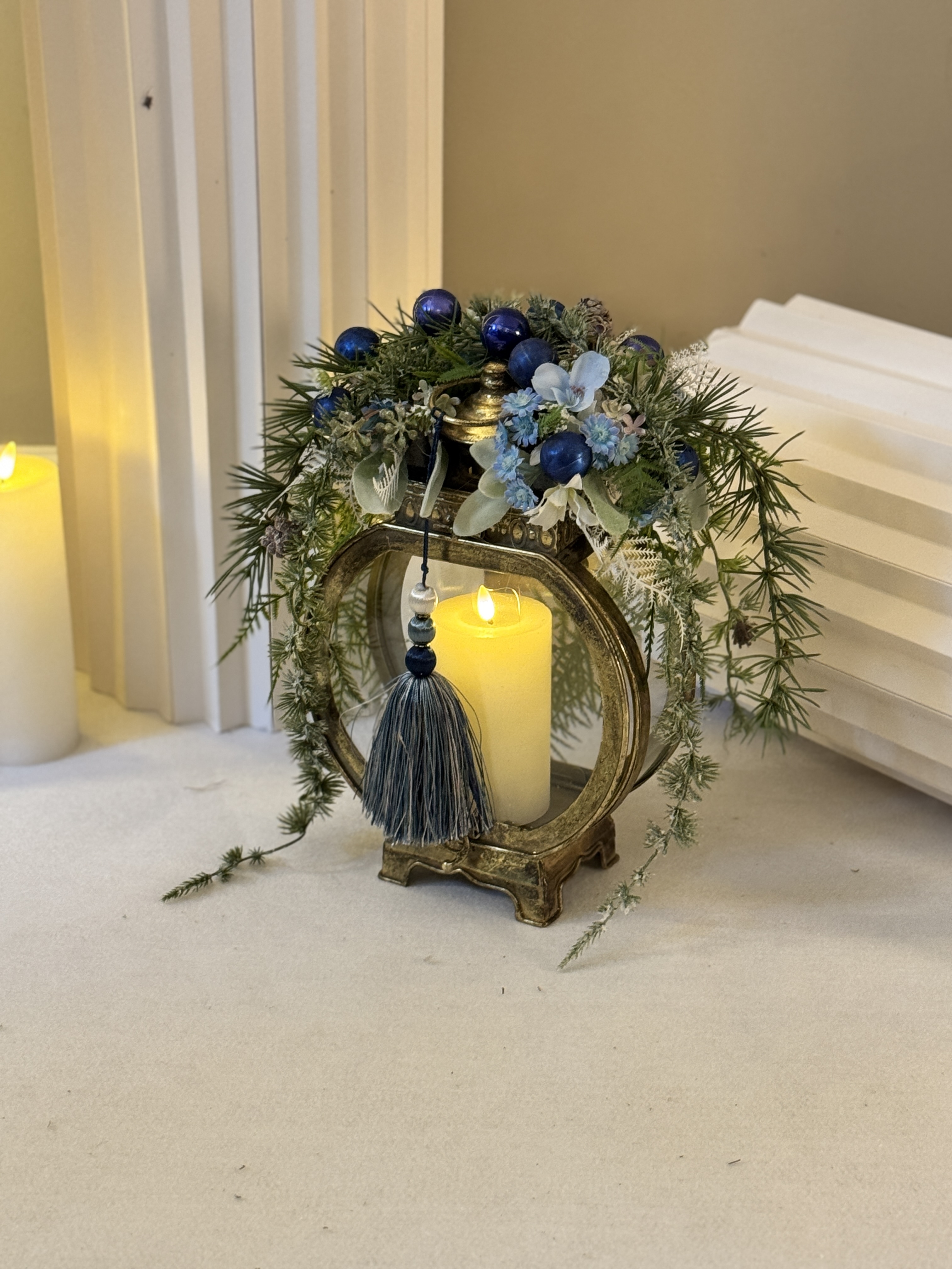 Górę latarni zdobi bogata kompozycja świąteczna w odcieniach niebieskiego, bieli i zieleni. Znajdują się w niej ozdobne gałązki, bombki, kwiaty oraz zimowe dodatki, które tworzą wyjątkowy stroik na Boże Narodzenie. Całość uzupełnia dekoracyjny chwost w odcieniach granatu, podkreślający elegancję i unikatowy styl ozdoby.