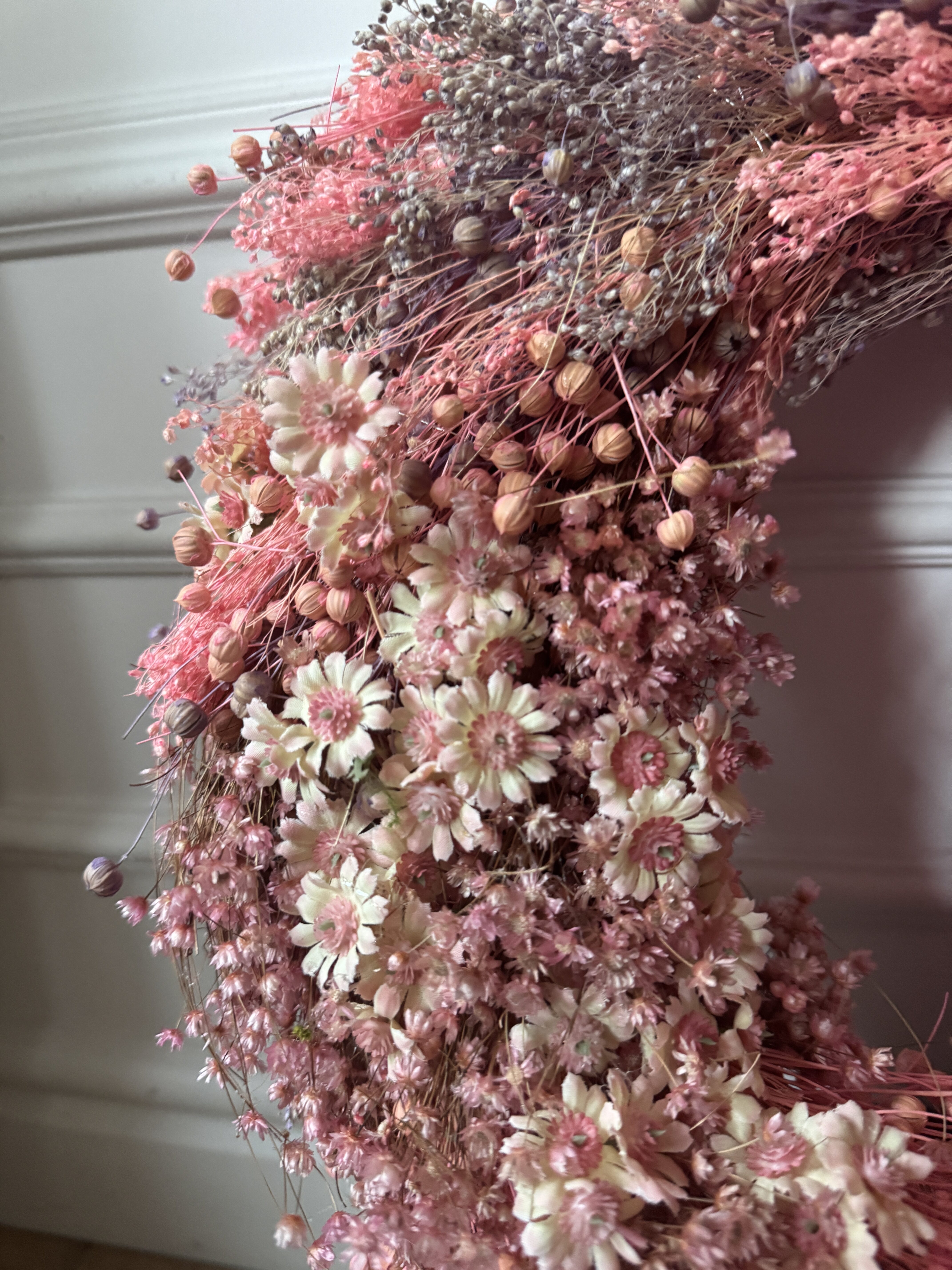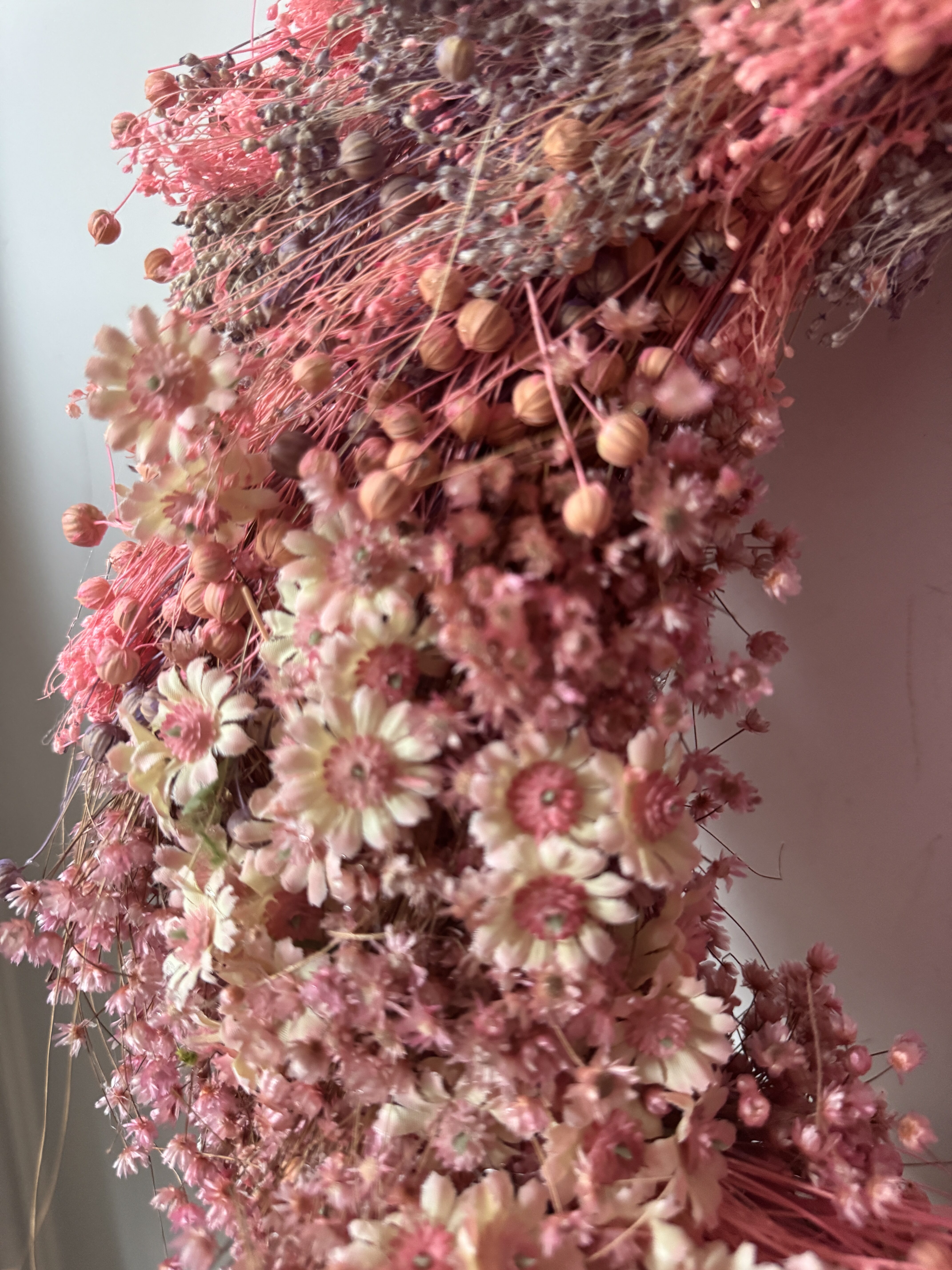 Wyjątkowy wianek na drzwi z suszonych kwiatów i naturalnego lnu w odcieniach pudrowego różu to elegancka dekoracja, która przyciąga uwagę już od progu. Ręcznie wykonany z wysokiej jakości suszonych roślin – między innymi z suszonego lnu – zachwyca swoją delikatną strukturą, lekkością i romantycznym charakterem.