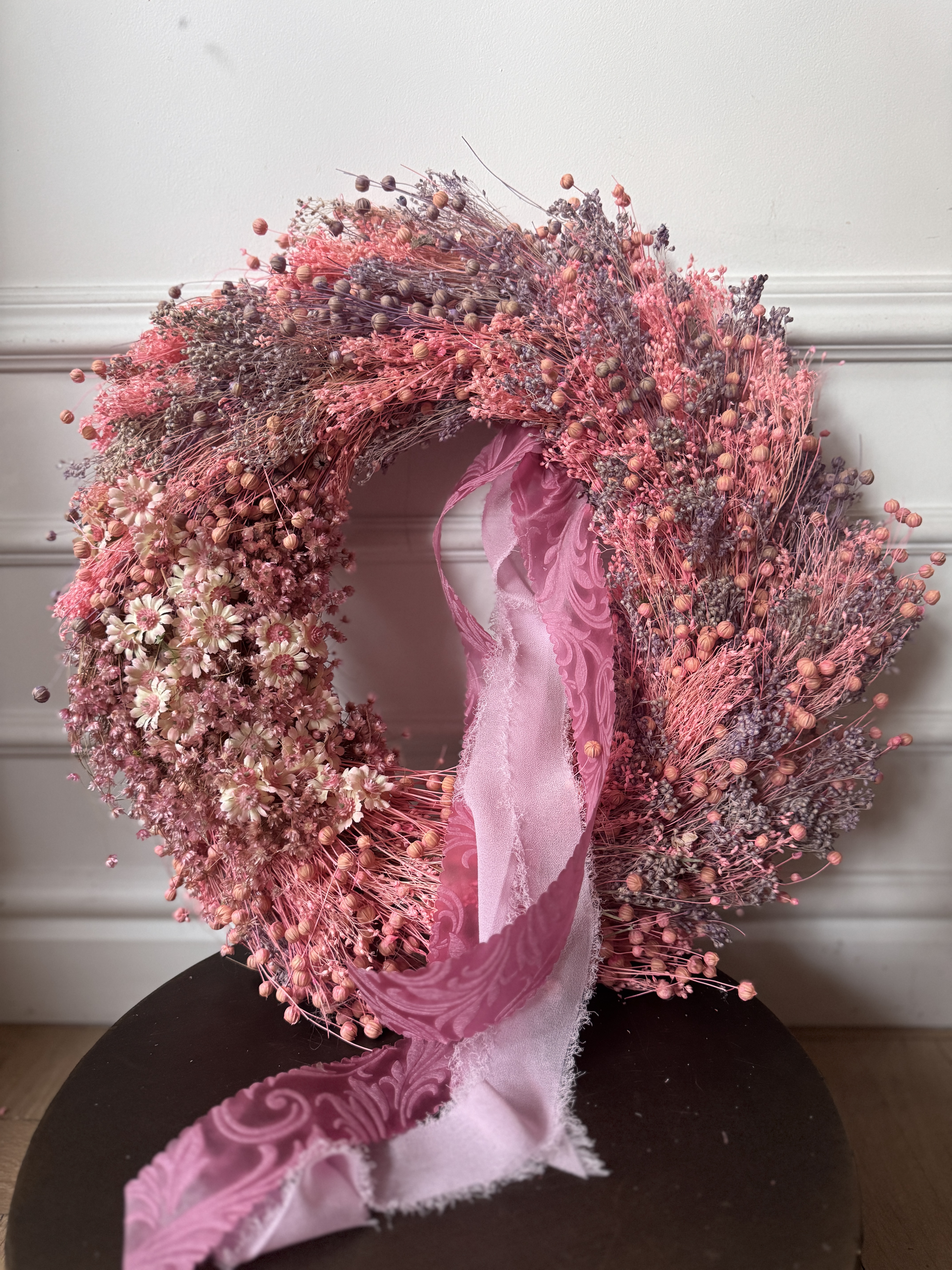- wianek na drzwi z suszonych kwiatów i lnu