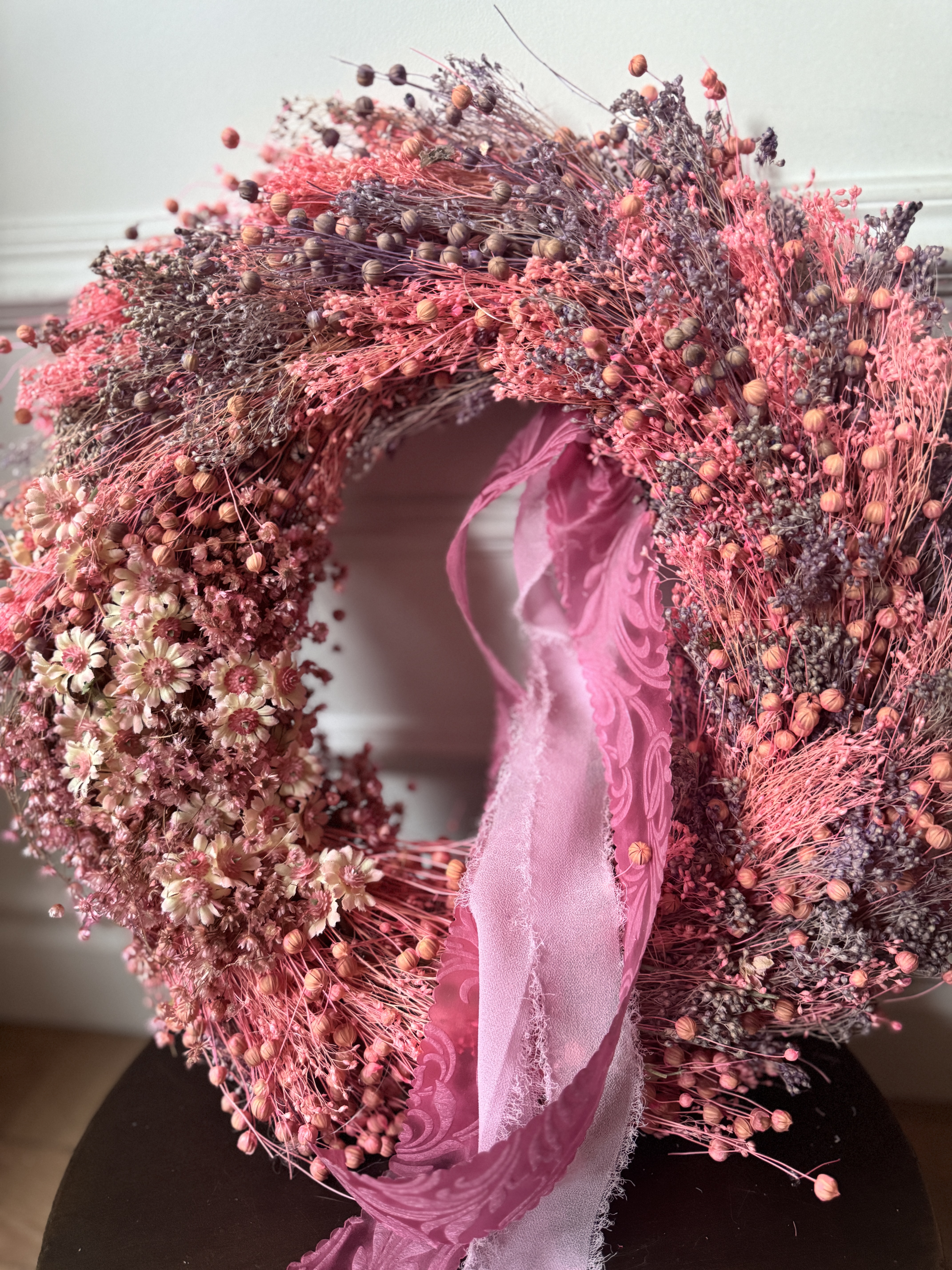 Bogata kompozycja drobnych kwiatów, traw i nasion tworzy harmonijną, naturalną całość w stylu boho i rustykalnym. Całość dopełnia ozdobna różowa wstążka, która nadaje wiankowi subtelnej elegancji i sprawia, że pięknie prezentuje się na drzwiach wejściowych lub wewnętrznych.