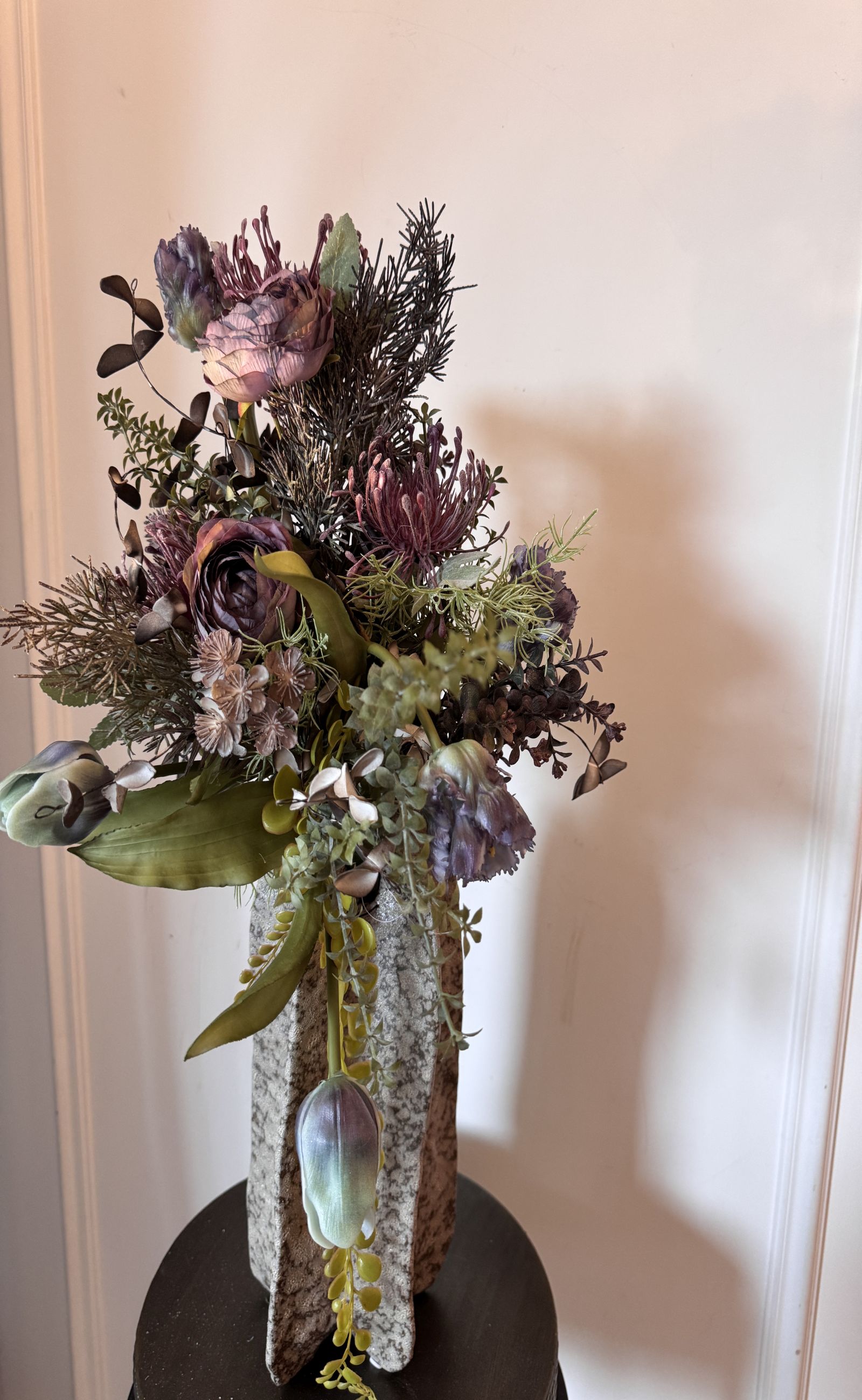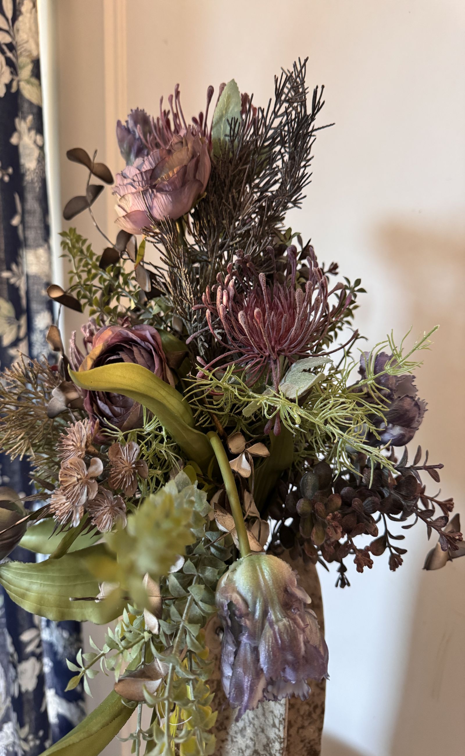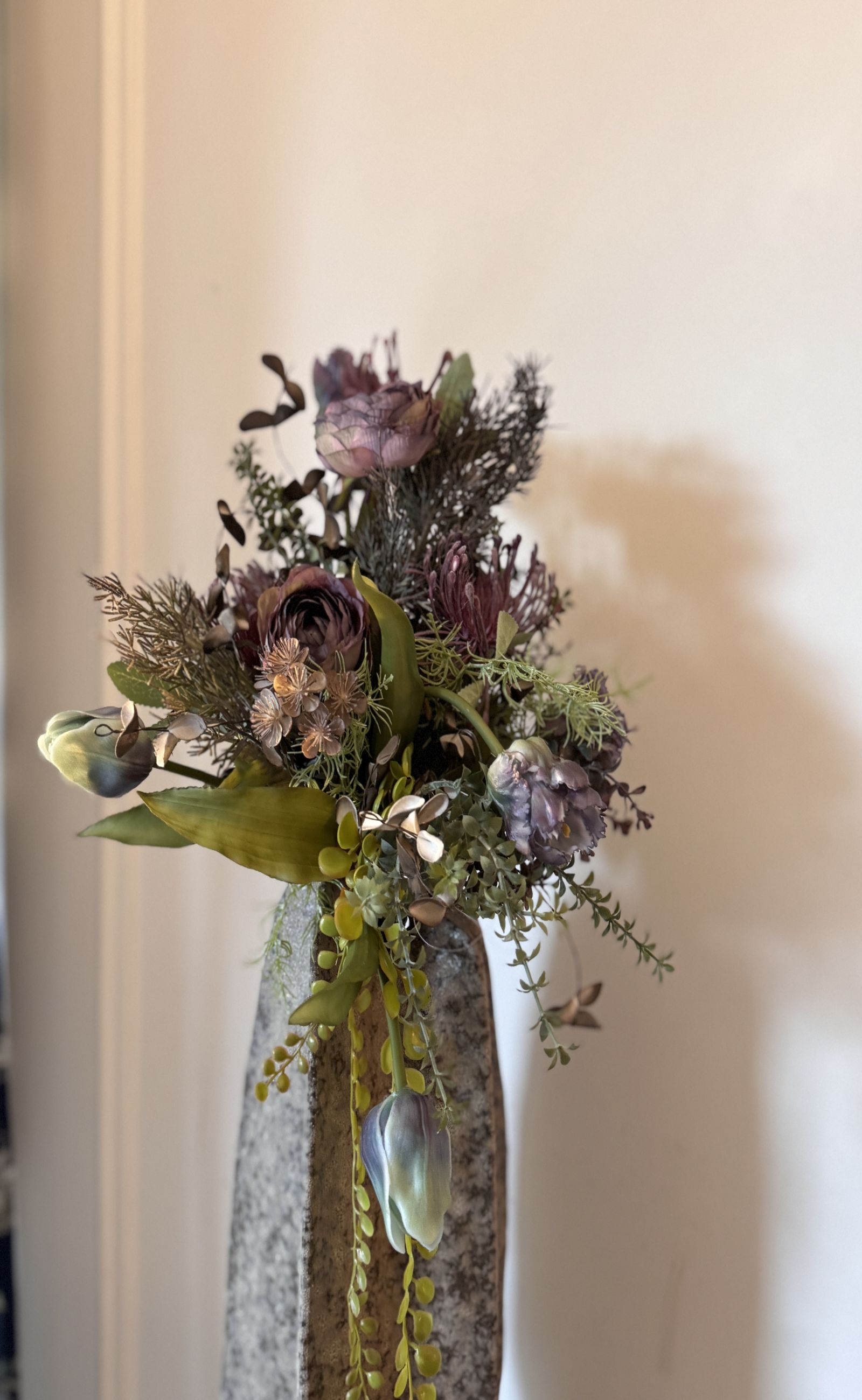Wyjątkowy bukiet nagrobny z kwiatów sztucznych, który doskonale sprawdzi się jako estetyczna i trwała dekoracja grobu. Kompozycja utrzymana jest w stonowanej, a zarazem eleganckiej kolorystyce – dominują pudrowe róże, fioletowe silikonowe tulipany, delikatna zieleń oraz jasne, dekoracyjne dodatki florystyczne.