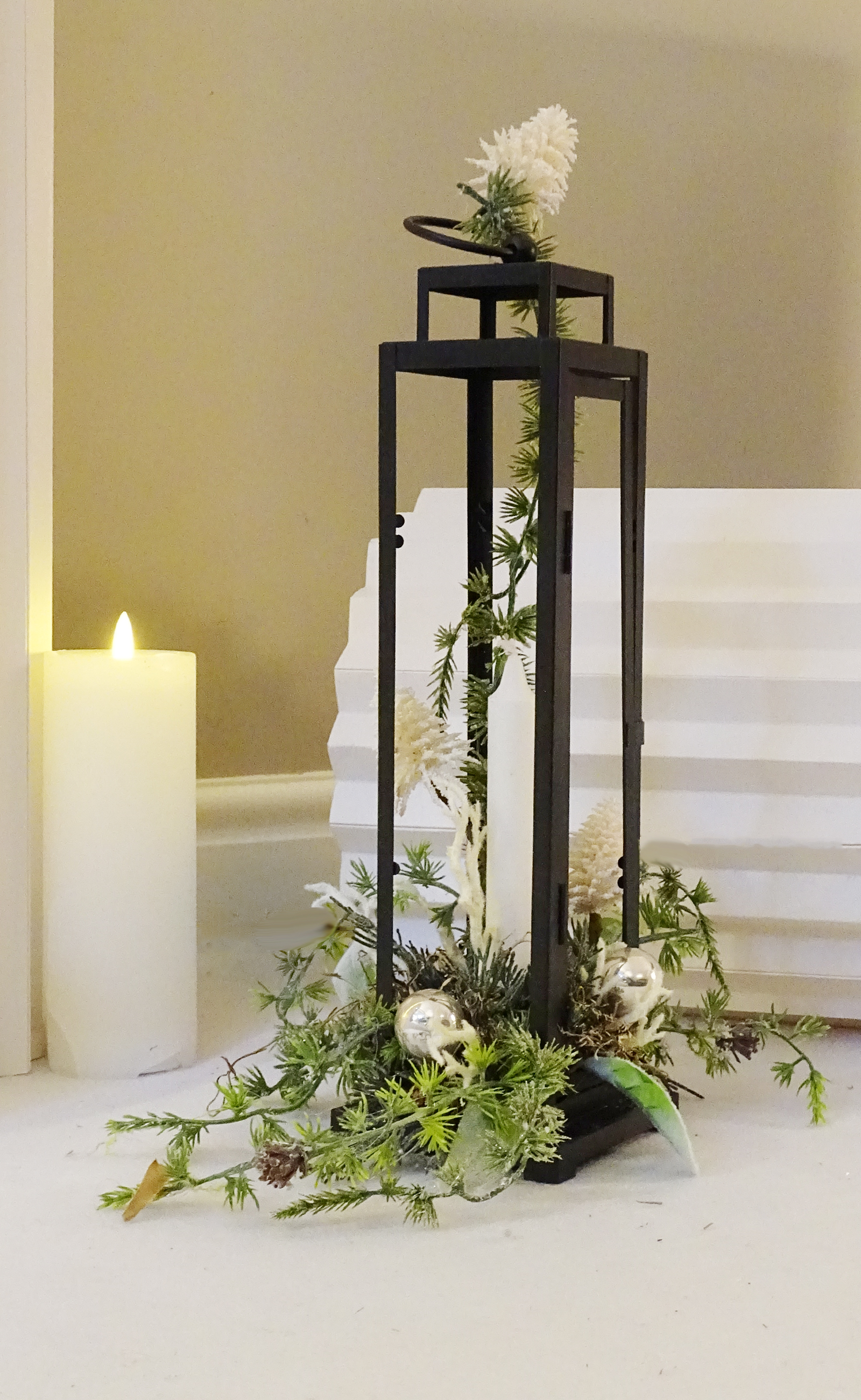 Stylowa dekoracja nagrobna z latarnią świąteczną to wyjątkowy stroik na cmentarz, idealny na okres Bożego Narodzenia i zimowe miesiące. Czarna, wysoka latarnia wypełniona jest delikatną świecą i ozdobiona gałązkami igliwia, szyszkami oraz delikatnymi akcentami, które nadają całości eleganckiego, świątecznego charakteru. U podstawy kompozycji znajduje się gęsto ułożone igliwie oraz subtelne ozdoby, dzięki czemu stroik prezentuje się efektownie i bardzo estetycznie.