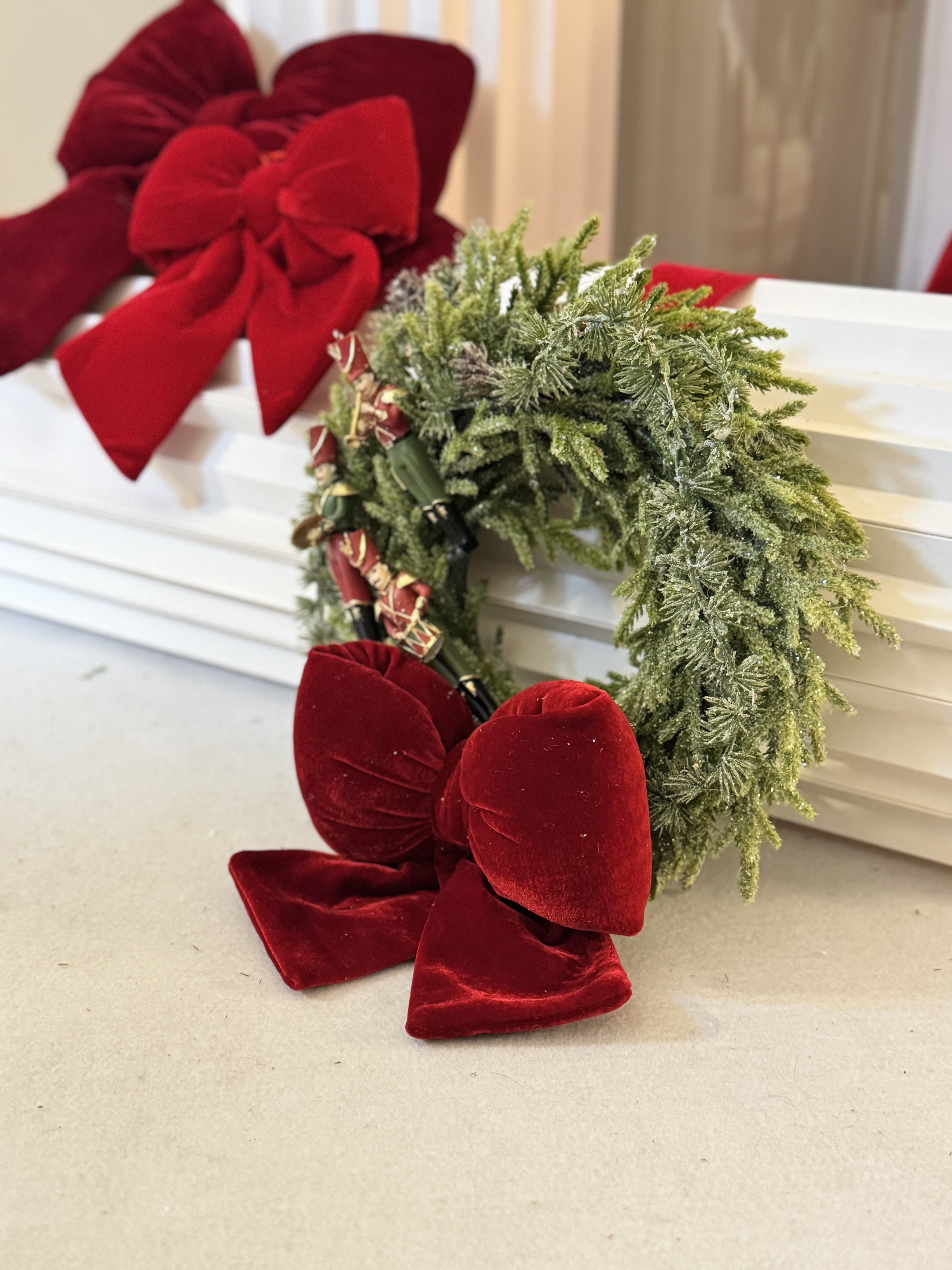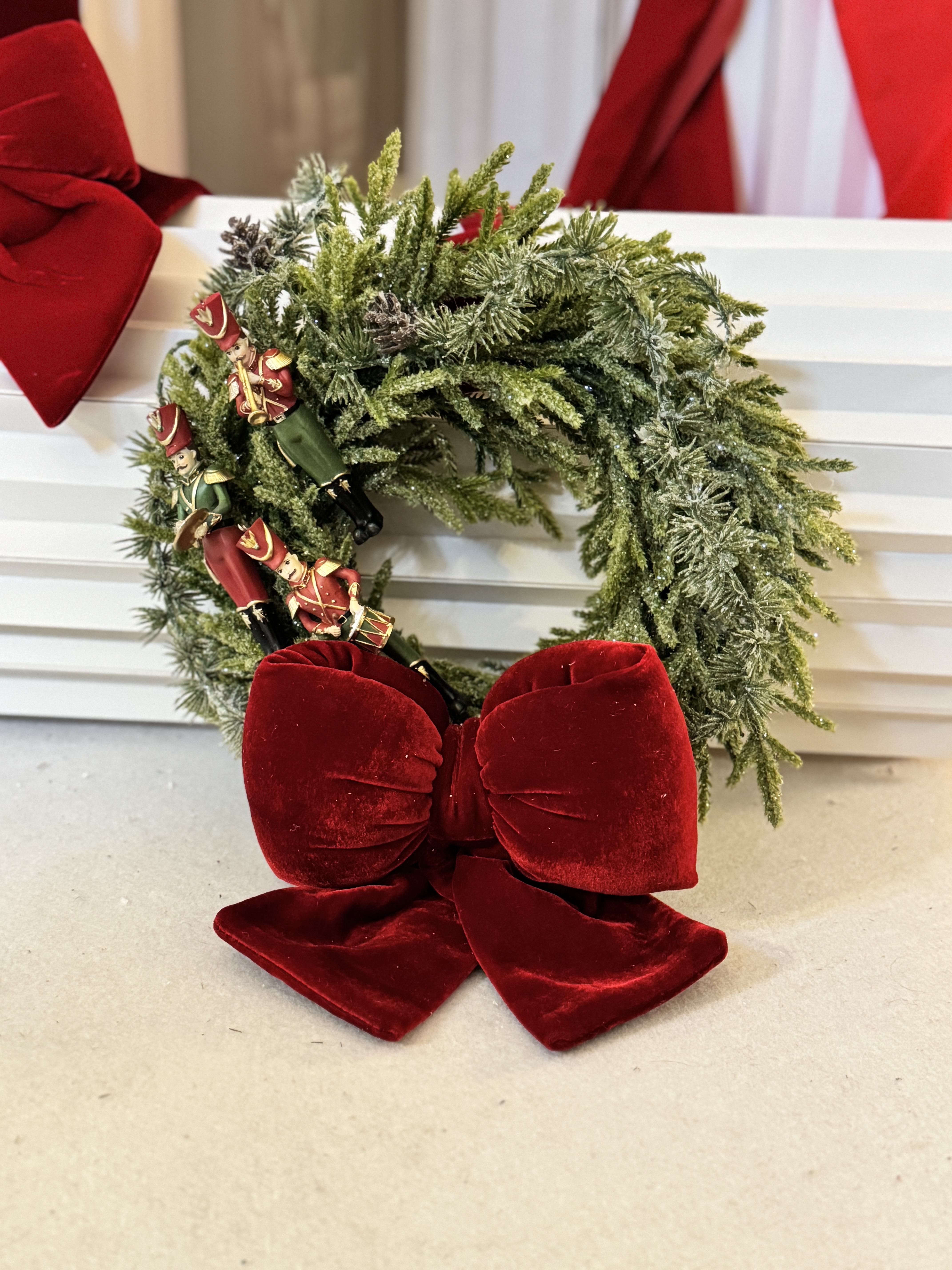 Najważniejszym elementem kompozycji jest duża, miękka aksamitna czerwona kokarda, dzięki której ten wianek bożonarodzeniowy wyróżnia się wśród innych dekoracji. Intensywna czerwień pięknie kontrastuje z zielenią gałązek, tworząc ponadczasową, świąteczną kombinację kolorów, idealną na okres Bożego Narodzenia.