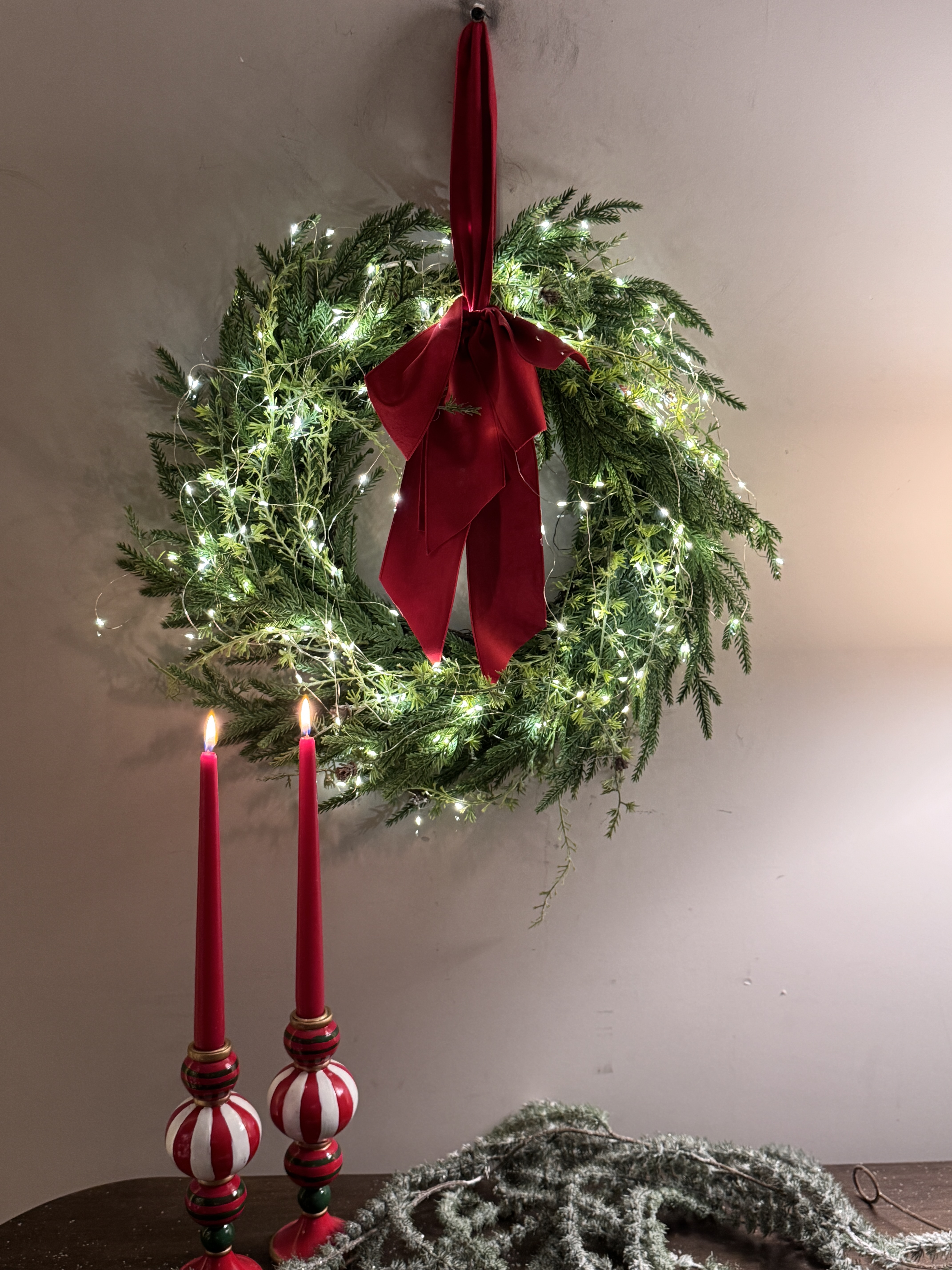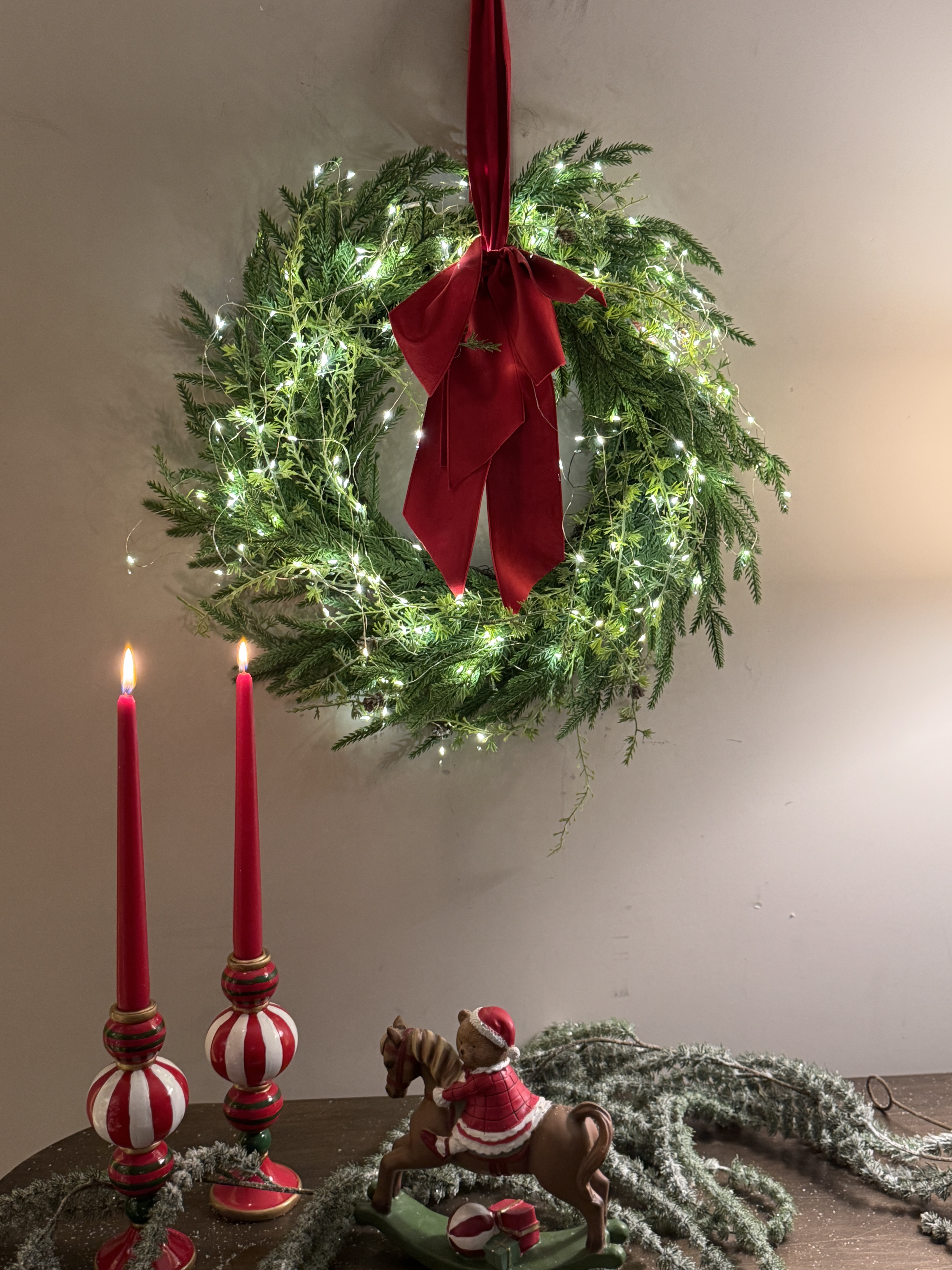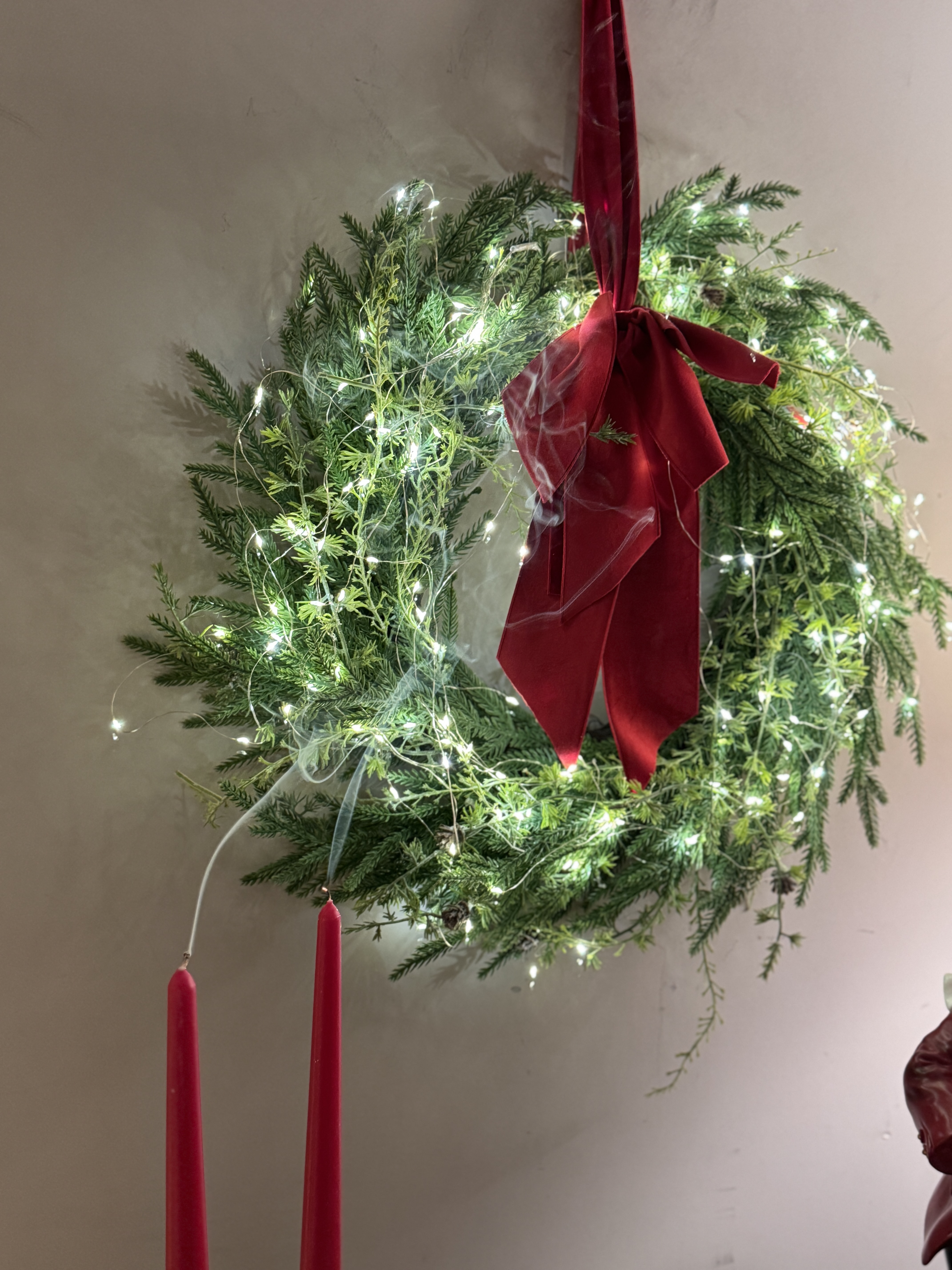 Świąteczny wianek na drzwi lub ścianę – naturalna zieleń, ciepłe światełka LED i elegancka czerwona kokarda