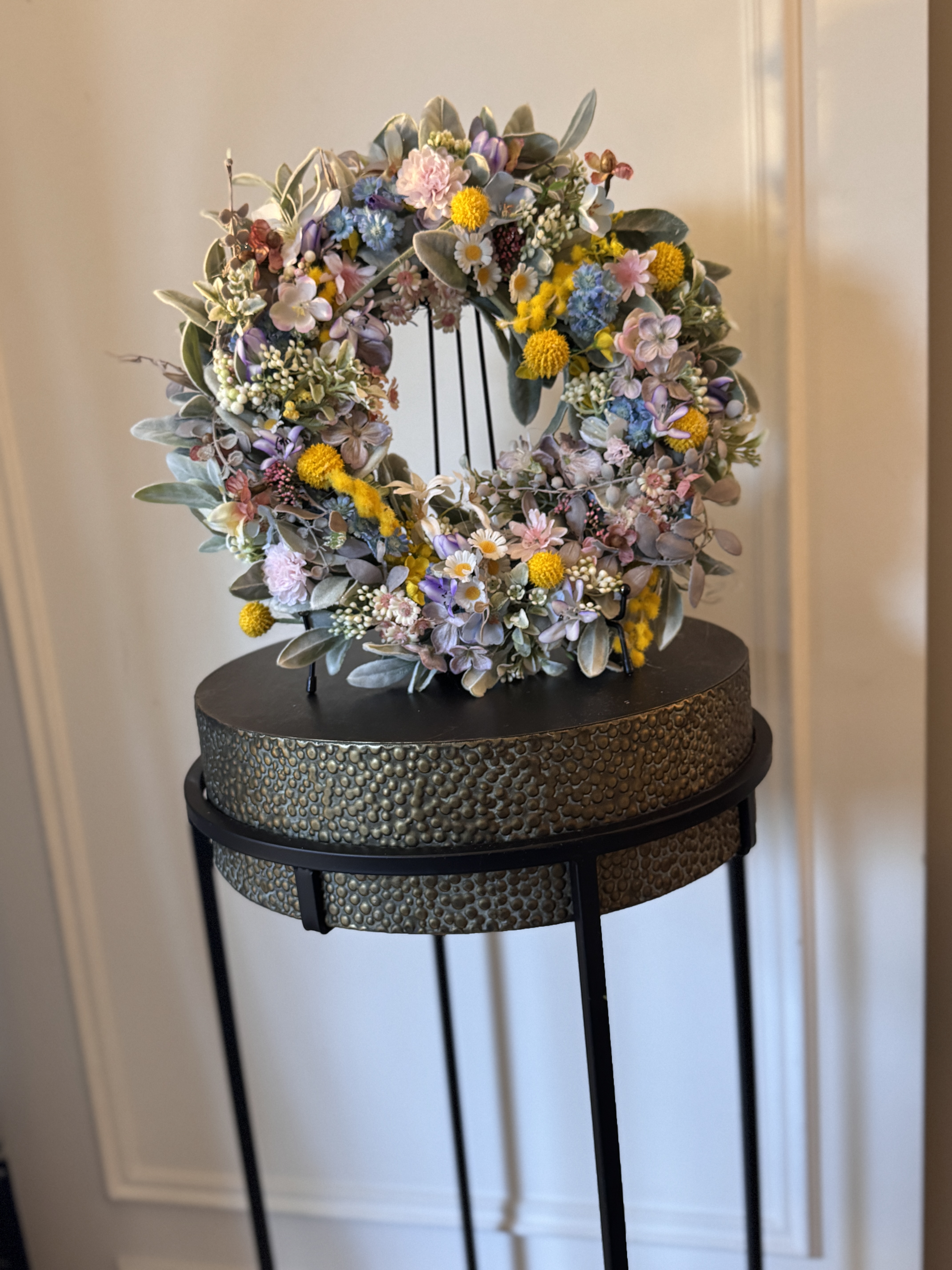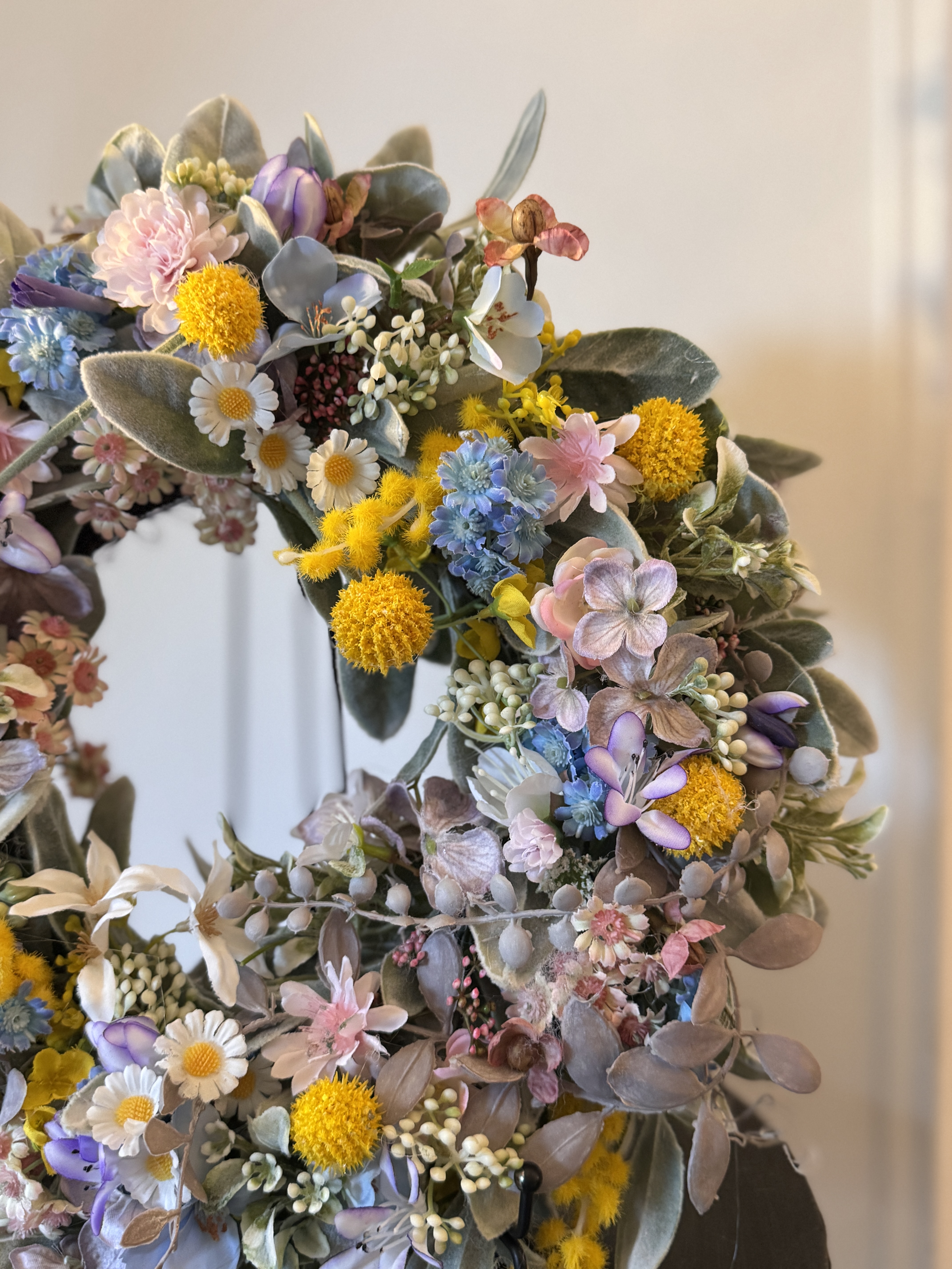 Kompozycja została stworzona z wysokiej jakości sztucznych kwiatów, takich jak stokrotki, drobne kwiaty polne, pastelowe hortensje oraz żółte akcenty kwiatów mimozy. Całość uzupełniają miękkie, welurowe liście w odcieniach zieleni i srebra, które nadają wiankowi naturalnej lekkości i elegancji.