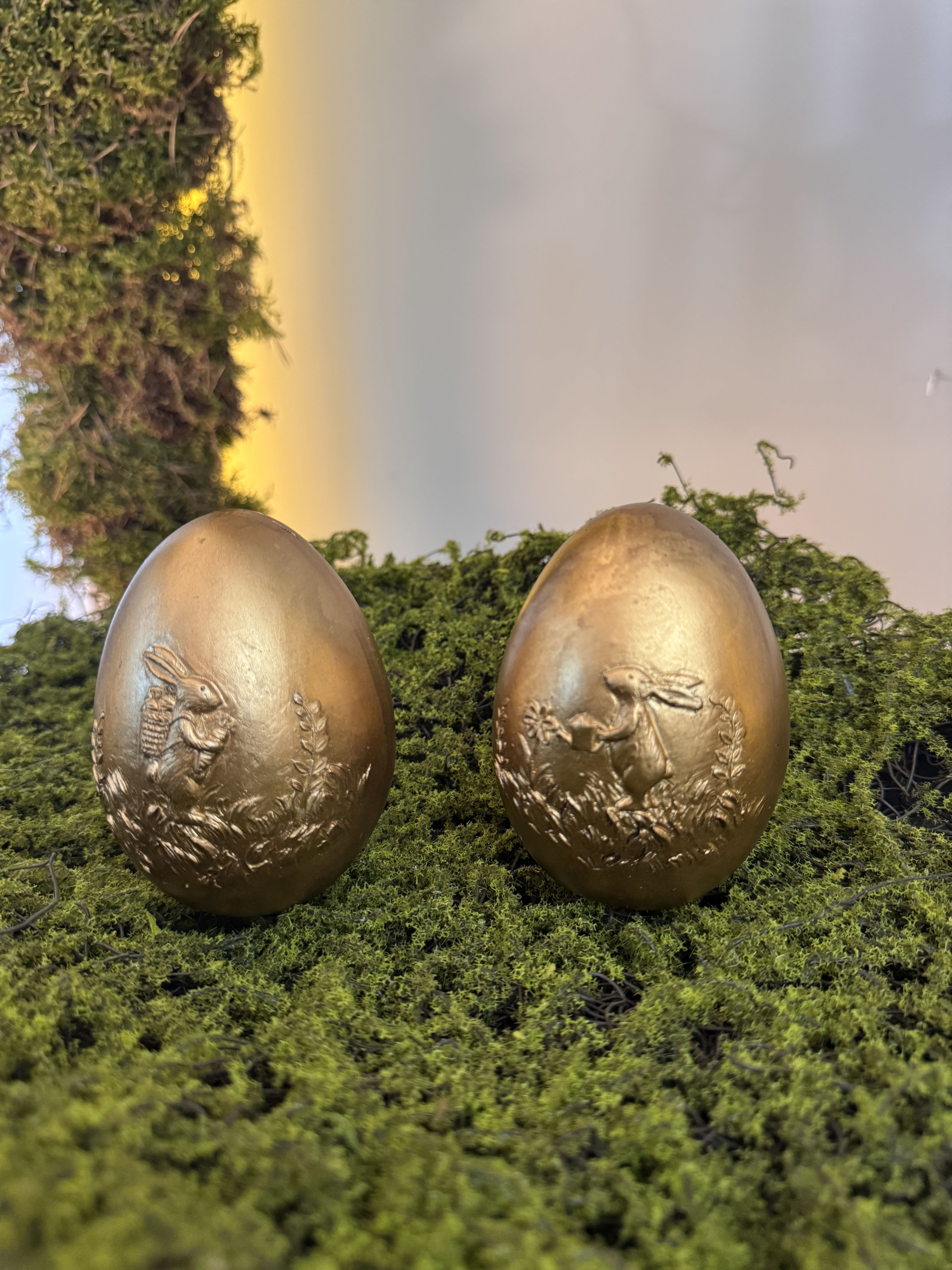 Stylowe złote jajka wielkanocne to wyjątkowa dekoracja, która doda Twojemu wnętrzu elegancji i świątecznego charakteru. Wykonane z dbałością o detale, ozdobione subtelnym, tłoczonym motywem zajączków i roślin, przyciągają uwagę i wprowadzają wiosenny klimat.